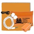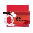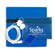 Tech Pouch comes with unimprinted 6" x 6" Microfiber Cleaning Cloth, UL Listed USB Wall Charger and white headphone earphones.