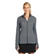 Nike Golf Ladies Therma-FIT Hypervis Full-Zip Jacket. For lightweight, allover warmth and temperature regulation, this jacket excels with Therma-FIT fabric The chevron design across the chest provides interesting two-tone color detail Distinctive contrast color at the neck and zipper, plus a brushed interior makes this versatile layering piece a golfing essential Tailored for a feminine fit Details include a reverse coil zip-through collar, open cuffs and an open hem Thumbholes at cuffs for warmth and enhanced fit The contrast Swoosh design trademark is embroidered on the left hem Made of 10.2-ounce, 100% polyester Therma-FIT fabric.