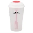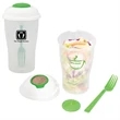 Consisting of food grade plastic, this 6.5" x 4" on-the-go salad cup includes a large cup to hold your salad and a small dressing cup. Featuring a dressing cup to keep your lettuce fresh and a plastic fork right in the container, this BPA free, FDA compliant cup is dishwasher safe and perfect for your next event. Your clients who frequently pack a lunch will appreciate the versatility of this promotional giveaway. Cup is clear with your choice of accent color.