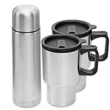Pacifica - stainless steel travel drinkware set. Best seller. Vacuum bottle: 16 oz capacity. Double wall stainless steel construction. Push and pour mechanism. Mugs: 14 oz capacity. Stainless steel exterior with durable plastic liner. Spill proof lid with a slide to open/close. Includes travel case. Bottle size: 7 1/2" h x 2 3/4" diameter. Mug size: 5 3/4" h x 3 1/2" diameter. BPA free.