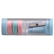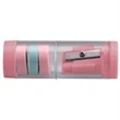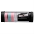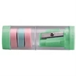 This handy sharpener equipped with a stainless steel blade fits regular size pencils. Comes with an erase at the end. It constructed with clear plastic case. Stable case prevents pencil shaving spills, and easy to open and clear. It makes a great desk accessory for school or office. Perfect for pairing with your company name and logo. Enhance your marketing campaign with this practical product!