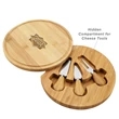Turn heads in your direction with ease at the next advertising event with this bamboo swivel cheese board with knife set! The Feta bamboo set features a hidden swivel base with tools and includes three stainless steel serving utensils with bamboo handles. The convenient 9" diameter x 1.5" high compact size and juice groove detail make it a useful kitchen item that's made of natural bamboo wood. This item is great to take a long to outdoor picnics and makes an excellent gift as well. It comes with a lifetime warranty. Add your unique imprint to create a marketing tool everyone's sure to love!