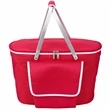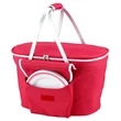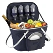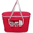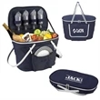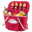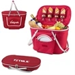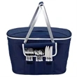 This picnic set for four makes it easy to share your brand with friends! Made of 600 denier polyester canvas with lightweight and durable aluminum frame, it features a Thermal Shield insulated, leak-proof, food-safe lining to keep food and drinks at the perfect temperature for hours. It comes with a setting for four people, including plates, glasses, flatware and napkins. It folds flat for storage and has permanent built-in side supports (no installation required) to hold the empty cooler upright for easy loading and compact transport after events. The zippered lid, front pocket and swivel handles with a padded grip lend to its traditional tapered basket shape. Designed and assembled in the USA, it's a stylish way to enjoy dining at any outdoor event and comes with a lifetime warranty!