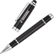 Get the best of both worlds with a pen and stylus in one! This brass rollerball pen comes with a cap-off design, carbon fiber barrel, chrome trims and a capacitive stylus that works with touchscreen devices. You can easily customize each one to promote your company and its products and services using laser engraving. A triangular shaped gift box is included.