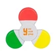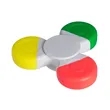 Made of Polypropylene plastic with Steel bearings;Multi-function writing instrument and tri-spinner made of Polypropylene plastic with Steel bearings; White body with 3 different chisel-tip highlighter colors with caps to match (one highlighter each in Red, Green, and Yellow); Spinner feature designed to relieve stress and anxiety; Approx rotation time is 35 seconds; Product Size: 3.125" w x 3.125" h x 0.5" d;