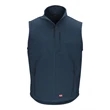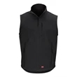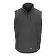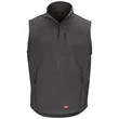 Red Kap Soft Shell Vest ul)10.3 oz./yd2, shell is 96/4 polyester/spandex. Lining is 100% polyester fleece. Water-resistant. Wind-resistant. Full-zip front with zipper garage. Stand-up collar with fleece lining. Convenient chest pocket and two on-seam hand pockets all with zipper closures.