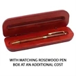 Go extravagant and luxurious with this twist pen made of rosewood. With your company's name and logo engraved on the pen body, this would sure make a lasting impact to your clients. You can pair it with the matching rosewood pen box with engraved logo or name on the cover to make a complete effect. Standard writing Ink color: Black, Blue Price Includes: Free setup Free laser engraving on one side Free virtual proof FREE SHIPPING to 1 US location