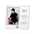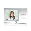 A single sheet of brilliant starfire glass is pierced with a metal pin to create an elegant easel stand over which a gold or silver metal bezel holds your photo and a generous imprint area.
