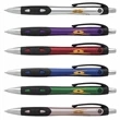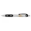 Make an indelible mark on your customers and supporters when you make a gift or giveaway of some quality writing gear by Souvenir®. The Sol pen is sure to create a sunny promotion. This 5 1/2 x 3/8 plunger-action ballpoint is made of rough ABS plastic with chrome accents, a black textured grip and curved pocket clip. Select from six cool colors and add your school, sports team, organizational or company logo or message to create item that's kind to your budget and bottom line.