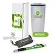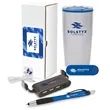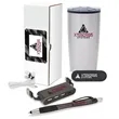 Welcome new customers and/or employees in style with this thoughtful gift set! The Splendid 5-piece welcome gift set gives recipients a chance take your brand wherever they go. The set includes a 20 oz. stainless steel double-wall tumbler with a colored polypropylene inner liner with a sliding closure lid and non-slip base pad. It also includes stereo earbuds with a 46" cable with color accents as well as a multi-use phone grip that can also be used as a phone stand. A plunge-action ballpoint pen and stylus is also included in the set. A 4-port type-A USB hub completes the set with type-A and type-C cables included. It all comes wrapped in a custom box. Add your company's name, logo, or emblem to the packaging and items. Make a great first impression with this loaded welcome gift set!