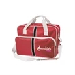 The Sporty Retro 420 denier jacquard polyester duffel bag featuring double zippered front pocket and detachable padded shoulder strap for additional comfort. Contrast racing stripe provides maximum brand attention. Accessories not included.