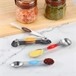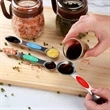 The measuring spoons are made of superior food grade stainless steel and thick polished metal and all-in-one structure, which is rustproof, smoother and sturdier to use without bending or deformation and dishwasher safe for fast cleanup. The measuring spoons double ended design makes it compatible for measuring the dry and liquid items. Round end for measuring liquid ingredient and the narrow oval end can fit in most spice jars or bottles. The flat bottom design keep your tablespoon measuring spoon rest on the counter won't tip over and spilling. Set of 8 stainless steel magnetic Measuring spoons: Leveler, 1/8 tsp, 1/4tsp, 1/2tsp, 3/4tsp, 1tsp, 1/2 Tbsp, 1Tbsp, This measuring spoon set includes a useful leveler to help you level condiments, meet all your needs on cooking and baking.