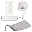 Within a small drawstring microfiber pouch are some items that pack a huge punch! This Tech Accessory Kit includes ear buds with a microphone, a silicone phone wallet with stand, and a charge-it-up power bank. There's no excuse for a low battery! Your brand name will go on 1 location on each item in one color. Anyone who uses this will automatically advertise your company. What a great way to boost your business!
