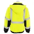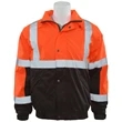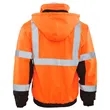 Our tall class 3 bomber jacket is made of 100% polyester 300 denier oxford with PU coating and 100% black polyester fleece liner. It's waterproof with sealed seams and includes a detachable hood (hood storage in collar), left interior chest pocket, 2 exterior waist pockets, microphone tabs on both sides, and AwareLite reflective trim. This conforms to ANSI/ISEA 107 for design, color and reflectivity. It comes in Hi-Viz lime and Hi-Viz orange.