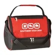 Made Of 600D Polyester With PEVA Lining. Adjustable Shoulder Strap And Padded Web Carrying Handle. 2 Side Mesh Pockets. Front Zippered Pocket. Double Zippered Main Compartment. Holds Up To 12 Cans. Spot Clean/Air Dry.